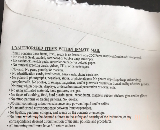 Even as facilities across the United States implement similar restrictions as those printed on this envelope, the physical mail has allowed for people to maintain meaningful relationships and access information. Aside from issues with mail loss, delays, and scanning failures (also here), digitizing and surveilling by-mail communications will effect how people express themselves and maintain their shared humanity through the physical mail.