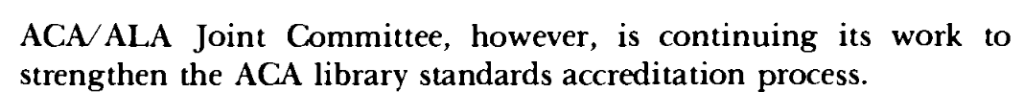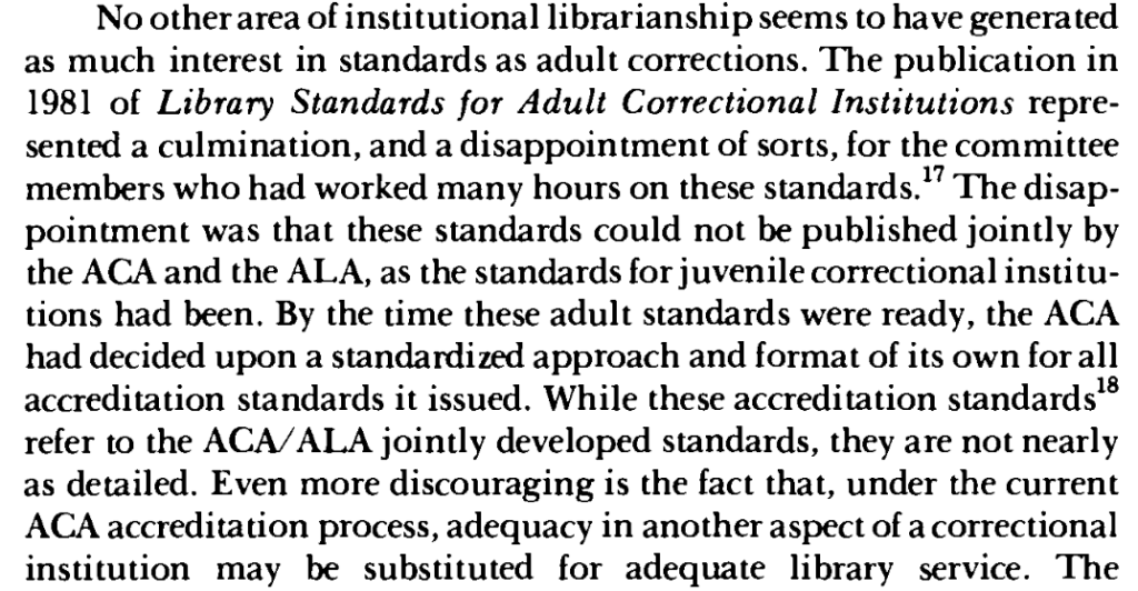 Update 1/9/22: Richard Miller’s 1982 article on institutional library standards briefly discusses the coordinated work of ACA and ALA on the 1975 Library Standards for Juvenile Correctional Institutions as “nothing short of a major coup, because a nonlibrary organization joined with ALA to issue library standards.” There is mention of the effort for a joint revision of the adult standards as, “bogged down when ACA decided to make changes in its accreditation process.” Miller expand on this–